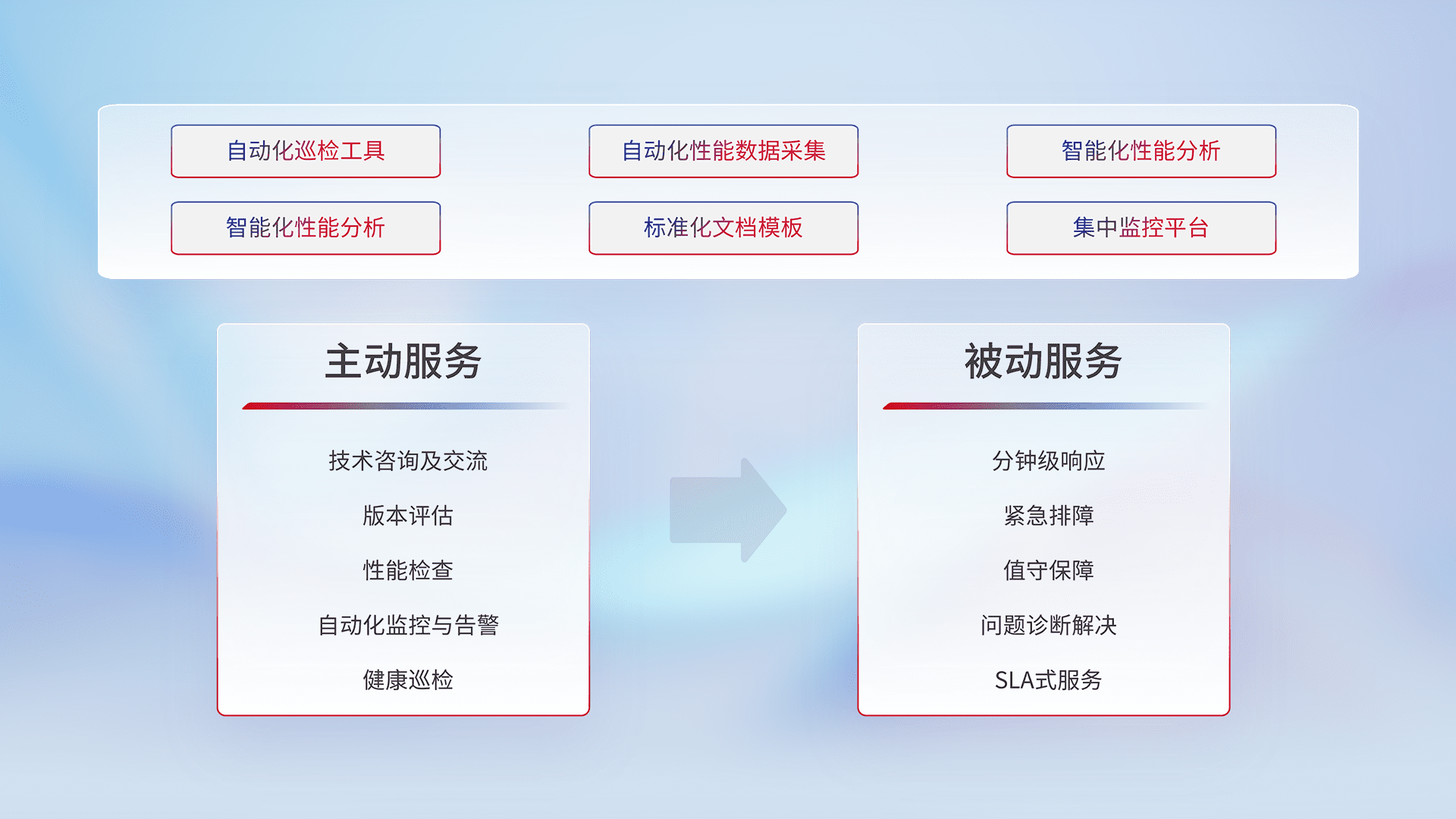 智能化工具和标准化文档,,,,保障服务质量,,,提供主动服务(包含技术咨询、、、、版本评估、、、、性能检查、、自动化监控与告警、、健康巡检)和被动服务包含(分钟级响应、、、紧急排障、、、、值守保障、、问题诊断解决、、SLA服务)。。。
